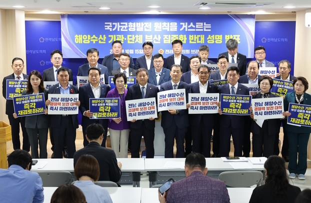 [무한뉴스=정민정 기자] 전라남도의회 농수산위원회 최동익 의원(더불어민주당·여수)은 10월 15일 제394회 임시회 도의회 브리핑룸에서 '국가균형발전 원칙을 거스르는 해양수산 기관·단체 부산 집중화 반대 성명서'를 발표했다.