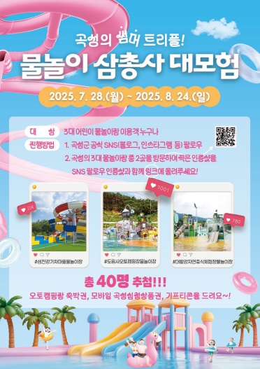 [무한뉴스=정민정 기자] 곡성군이 본격적인 여름 휴가철을 맞아 7월 28일부터 8월 24일까지 관내 주요 물놀이장을 연계한 ‘곡성의 썸머 트리플! 물놀이 삼총사 대모험 이벤트’를 진행한다.