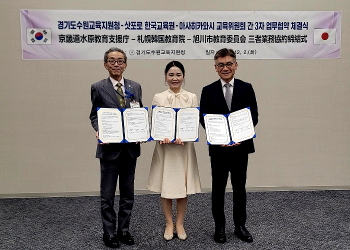 [무한뉴스=양현명 기자] 경기도수원교육지원청은 12월 2일 일본 아사히카와시 교육위원회에서 삿포로한국교육원과 함께 3자 국제교류 업무협약(MOU)을 체결했다. 이번 협약은 한·일 간 교육협력 체제를 제도적으로 구축하고, 경기교육의 우수정책을 해외와 공유하기 위해 마련됐다.