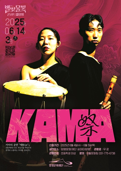[무한뉴스=정승훈 기자] 양평문화재단은 오는 14일 오후 3시, 양평문화재단 2층 씨어터양평에서'별빛물빛 콘서트 in 양평'6월 정기 공연으로 카마(K.A.M.A) 공연팀의 '제祭:je'를 개최한다.