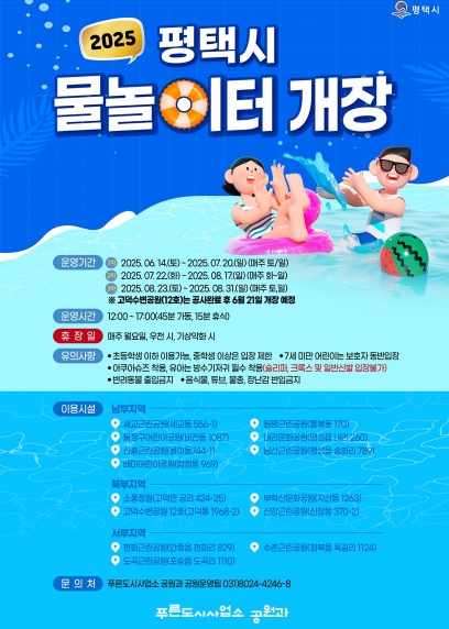 평택시 공원과장은 “물놀이터를 찾는 어린이들이 안심하고 즐길 수 있도록 위생관리와 안전사고 예방에 최선을 다하겠다”라며 “안전한 물놀이를 위해 시설별 이용 방법과 유의사항을 준수해 달라”고 요청했다.