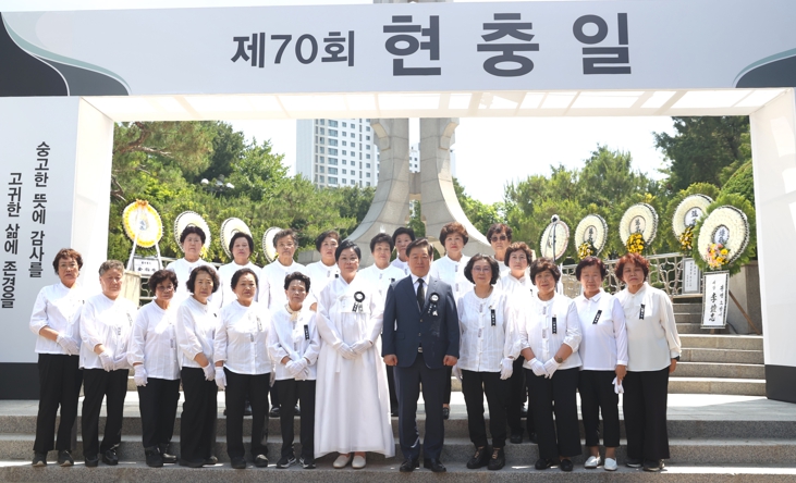 | ▲ 박승원 광명시장이 6일 오전 광명 현충공원 내 현충탑에서 열린 제70회 현충일 추념식에 참석한 전몰군경미망인회 광명시지회 회원들과 사진을 촬영하고 있다. |