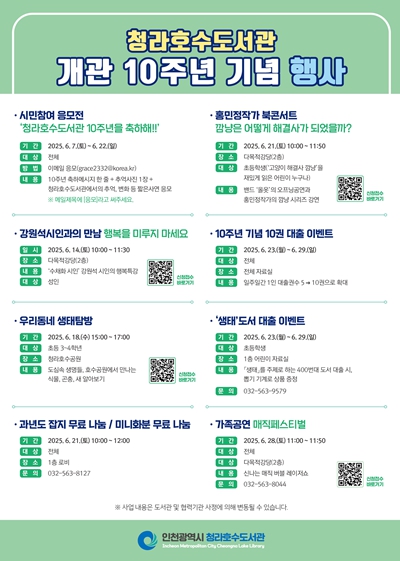 일부 행사는 사전 신청이 필요하며, 신청은 청라호수도서관 누리집 또는 안내문의 큐알(QR)코드 인식을 통해 가능하다.