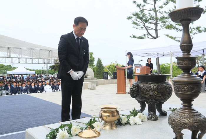 이날 추념식은 전국적으로 울린 사이렌 소리에 맞춰 순국선열 및 호국영령에 대한 묵념을 시작으로 헌화와 분향, 추념사 낭독, 헌시 낭송, 현충일 노래 제창 순으로 진행됐다.
