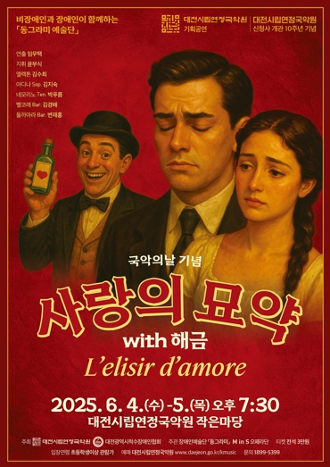 이번 공연은 장애 예술인과 지역 성악가가 함께 무대에 오르고, 국악기 반주와 함께 구성된 융합형 창작 작품으로, 국악의 확장성과 예술 간 소통을 시민과 함께 나누고자 마련됐다. 도니제티의 오페라‘사랑의 묘약(L’elisir d’amore)’을 한국 전통 악기와 함께 새롭게 해석해 선보이며, 남녀노소 누구나 즐길 수 있는 무대로 기획됐다.