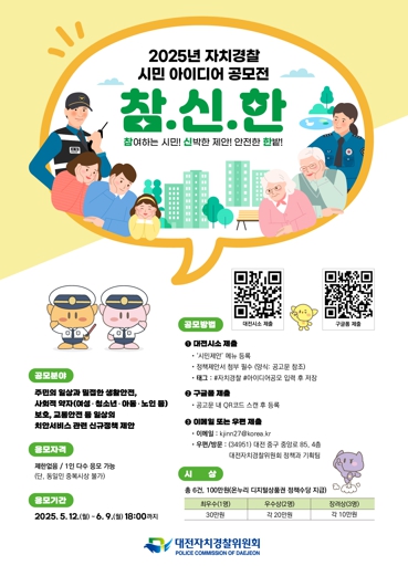 [무한뉴스=정민정 기자] 대전시 자치경찰위원회는 생활 속 치안 문제 해결을 위한 시민 참여형 정책 발굴 프로그램인 ‘2025년 자치경찰위원회 참신한 시민 아이디어 공모전’을 개최하고, 오는 6월 9일까지 시민 제안을 접수받고 있다.