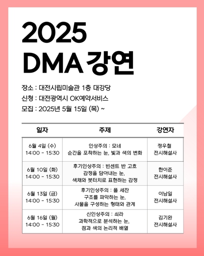 [무한뉴스=정민정 기자] 대전시립미술관은 오는 6월 4일부터 16일까지 미술관 대강당에서인상주의를 주제로 한 대중 강연 프로그램 ‘DMA 강연’을 운영한다.