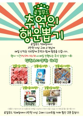 행사 기간 동안 로컬푸드 직매장에서 2만 원 이상 구매한 고객은 매일 선착순 100명까지 '추억의 뽑기' 이벤트에 참여할 수 있다.