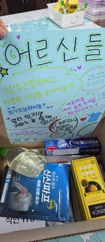 생필품 세트 및 직접 작성한 롤링페이퍼 등을 담아 의미 더해