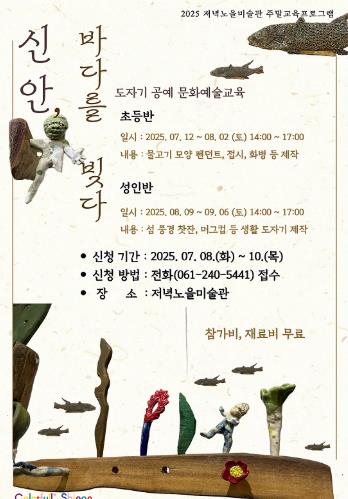 [무한뉴스=정민정 기자] 신안군 저녁노을미술관에서는 2025년 여름방학을 맞아 주말 도자기 공예 문화예술교육 프로그램 ‘신안, 바다를 빚다’를 운영한다.