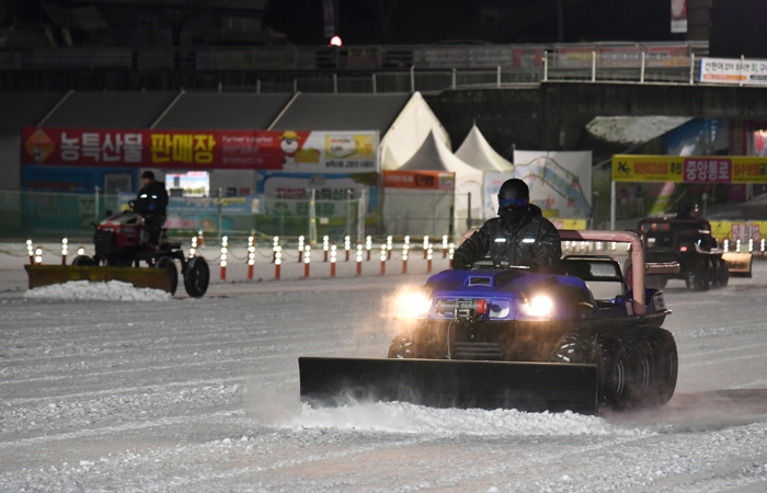 | ▲ 개막 이틀째인 11일 새벽, 화천산천어축제장에서 제설작업이 이뤄지고 있다 |