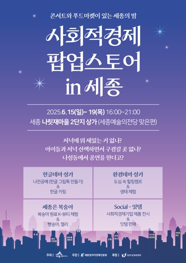 [무한뉴스=정민정 기자] 세종일자리경제진흥원은 오는 15일부터 5일간 나성동 일대에서 ‘사회적경제 팝업스토어 in 세종’을 개최한다.