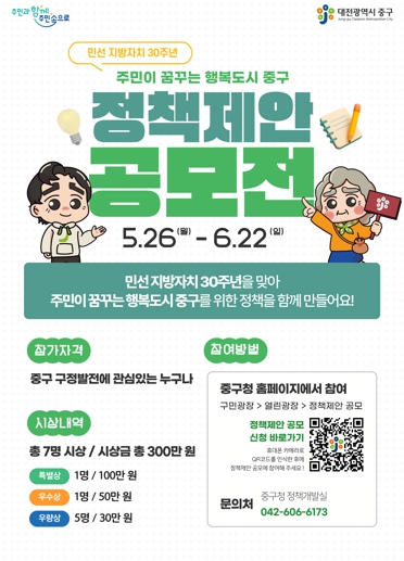 [무한뉴스=정민정 기자] 대전 중구는 민선 지방자치 30주년을 맞아 ‘주민이 꿈꾸는 행복한 도시 중구’를 만들기 위한 정책제안 공모전을 개최한다고 25일 밝혔다.