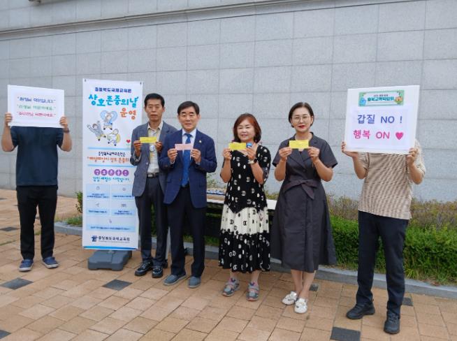 [무한뉴스=정민정 기자] 충청북도교육청 직속기관 국제교육원은 18일, 청렴 집중 주간을 맞아 공정과 소통의 청렴문화 전파‧확산 및 갑질예방‧상호존중 문화 정착을 위한 '갑질 버리고, 존중 키우고' 상호존중 캠페인을 전개했다.