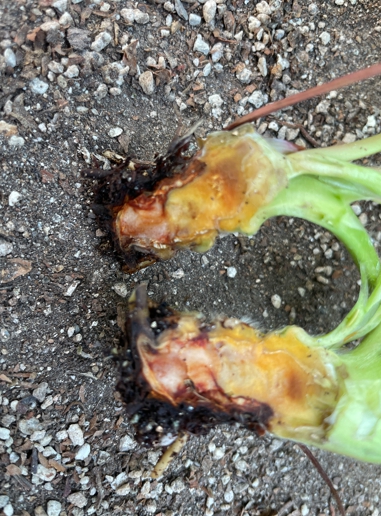 뿌리 감염 시에는 관부(짧은 줄기) 및 뿌리가 주황색 또는 갈색으로 변색되면서 고사 현상이 나타난다.