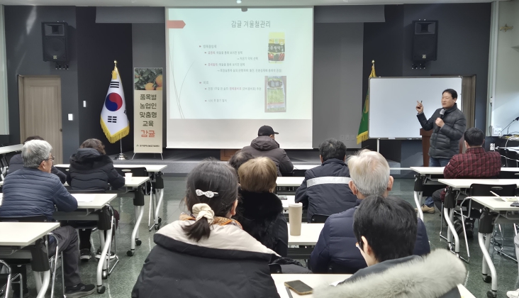 오전 교육은 대구농업기술센터 강당에서 진행됐으며, 겨울철 감귤 재배에 필수적인 온도 관리와 물 관리, 병해충 방제 요령, 적정 시비 방법, 가온 관리 기술 등 겨울철 핵심 관리 기술을 중심으로 이론 교육이 이뤄졌다.