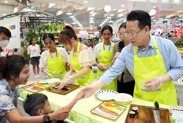 | ▲ 캄보디아를 방문 중인 김영록 전라남도지사가 13일(현지 시간) 프놈펜 이온몰 센 쏙 시티에서 열린 ‘전남 K-푸드 판촉전 in 캄보디아’행사에 참석, 현지 인기 인플루언서 ‘렝(Leng)’과 함께 김밥과 미역국을 직접 만들어 현지인들에게 소개하고 있다. |