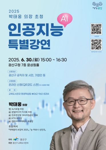 [무한뉴스=정민정 기자] 광주 광산구는 30일 오후 3시 구청 7층 윤상원홀에서 박태웅 녹서포럼 의장(‘AI 강의 2025’ 저자)을 초청해 ‘인공지능(AI) 특별강연’을 개최한다고 밝혔다.
