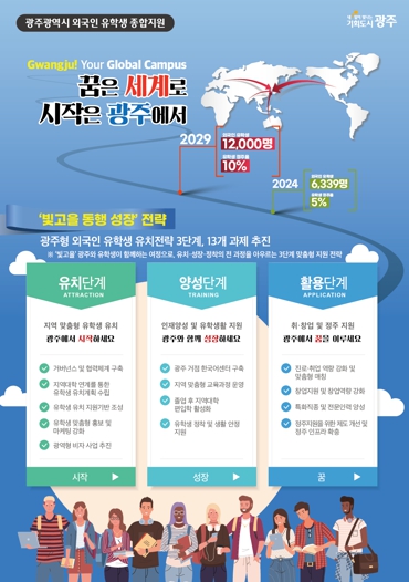 광주시는 ‘Gwangju, Your Global Campus-꿈은 세계로, 시작은 광주에서’라는 비전 아래 오는 2029년까지 외국인 유학생 1만2000명 유치와 정주율 10% 달성이라는 구체적 목표를 제시했다.