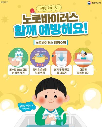 노로바이러스 감염증 예방을 위해서는 ▲흐르는 물에 30초 이상 비누로 손 씻기 ▲음식은 충분히 익혀 먹기 ▲설사 증상이 있거나 손에 상처가 있는 경우 조리하지 않기 ▲채소·과일은 깨끗한 물에 씻어 껍질을 벗겨 먹기 등 개인위생 수칙을 철저히 준수해야 한다.
