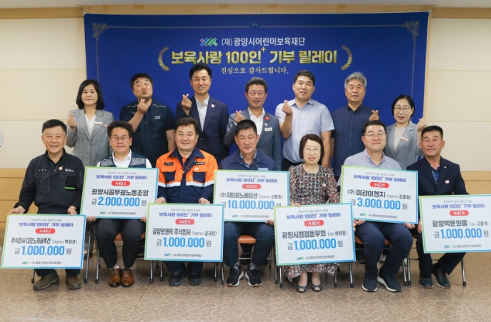 [무한뉴스=정민정 기자] (재)광양시어린이보육재단은 지난 7월 3일 광양시청 만남실에서 '보육사랑 100인+ 기부 릴레이' 후원금 기탁식을 개최했다고 밝혔다.