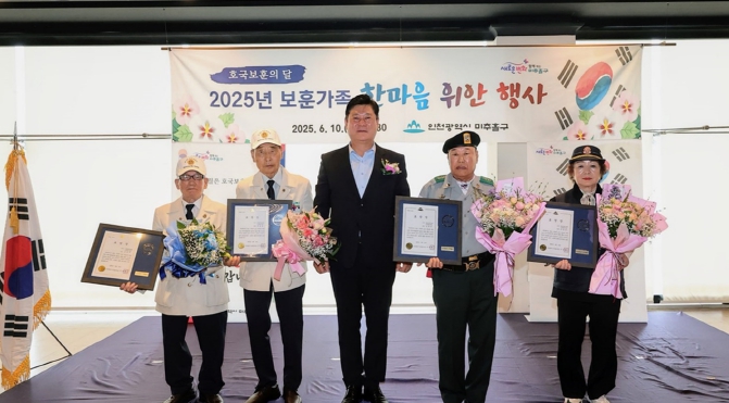 [무한뉴스=정승훈 기자] 인천 미추홀구는 호국보훈의 달을 맞아 10일 주안역 그랜드하우스에서 광복회 미추홀구지회를 비롯한 8개 보훈단체의 국가유공자와 보훈 가족 240여 명을 초청해 ‘보훈 가족 한마음 위안 행사’를 개최했다.