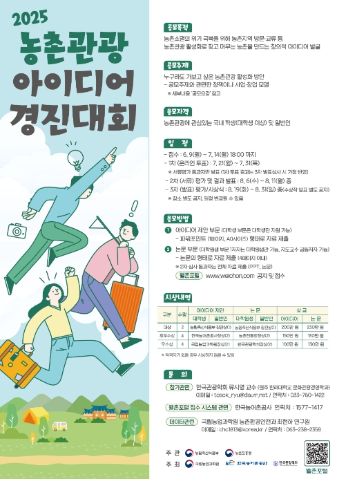 제출된 아이디어는 농촌, 관광 분야 전문가 등으로 구성된 평가위원이 ▲ 주제 참신성 ▲ 내용 전개 논리성 ▲ 현장 활용성 등을 평가하여 선정할 계획이다.