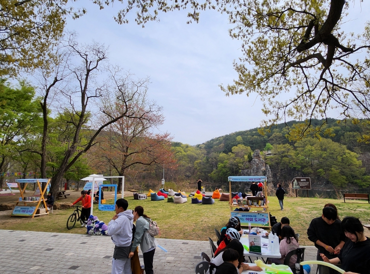 이날 선바위공원 야외도서관에는 빈백소파, 텐트, 파라솔 의자, 돗자리 등 100석과 베스트셀러·신간 등 도서 250권을 비치했다. 또 벚꽃 썬캐쳐, 이끼정원 등 자연체험행사와 도서관 수강생 작품 전시로 즐길거리를 더했다.