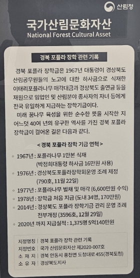 특히, 포플러 장학금은 1967년 박정희 대통령 하사금(16만원)으로 심은 이태리 포플러나무 매각 대금과 도 출연금 등을 재원으로 임업인과 산림분야 종사자 자녀 등에게 지급하는 장학금으로 국가산림문화자산으로도 등재돼 있으며 현재까지 1,465명의 학생에게 5억 9100만원의 장학금을 지급했다.
