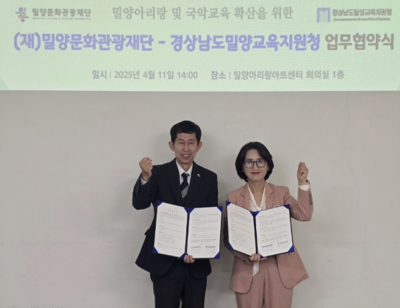 [무한뉴스=최진수 기자] 밀양문화관광재단(이사장 안병구)과 경상남도밀양교육지원청(교육장 박정화)은 11일 ‘밀양아리랑과 국악 교육 진흥을 위한 업무협약’을 체결했다고 밝혔다.