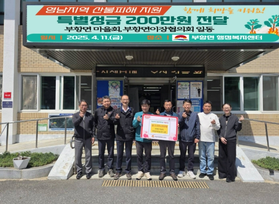 이현기 부항면장은 “이번 성금은 산불 피해 주민들이 역경을 딛고 다시 일어서는 데 큰 힘이 될 것”이라며 “기부해 주신 성금은 힘겨운 일상을 보내고 있는 이재민들의 일상 회복과 지역사회 복구를 위해 잘 전달하겠다.”라고 말했다.