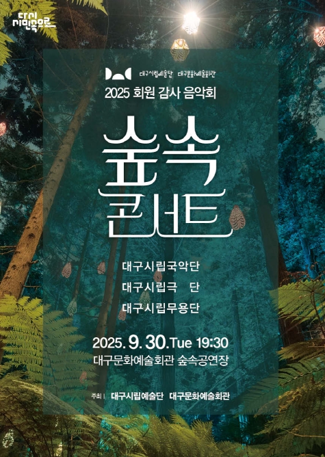 [무한뉴스=최진수 기자] 대구문화예술회관·대구시립예술단 2025 회원 감사 음악회 ‘숲속 콘서트’ 공연이 9월 30일 저녁 7시 30분 대구문화예술회관 숲속 공연장에서 펼쳐진다.