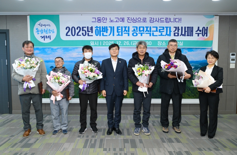 [무한뉴스=최진수 기자] 거제시는 26일 시청 시장실에서 2025년 하반기 정년 퇴직을 맞은 공무직 노동자에게 감사패를 수여하며, 인생 제2막의 새로운 출발을 응원했다.