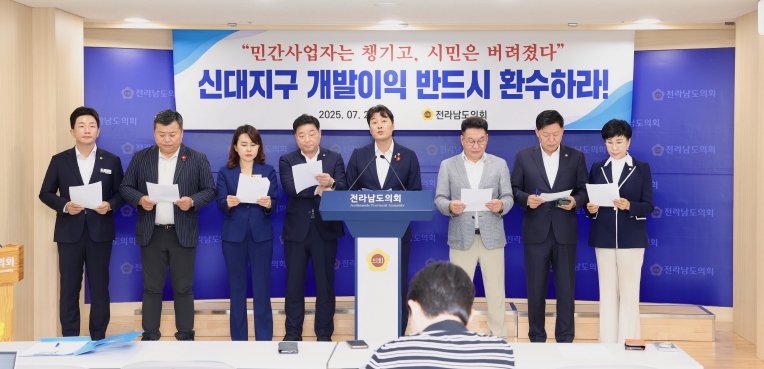 [무한뉴스=정민정 기자] 전라남도의회 순천지역 의원들은 7월 28일 공동성명을 통해 “순천 신대지구 개발을 통해 민간사업자는 천문학적인 이익을 챙겼지만 정작 순천시민에게 돌아온 것은 아무것도 없다”며, “광양경제자유구역청과 순천시는 즉각 개발이익 환수에 나서야 한다”고 촉구했다.