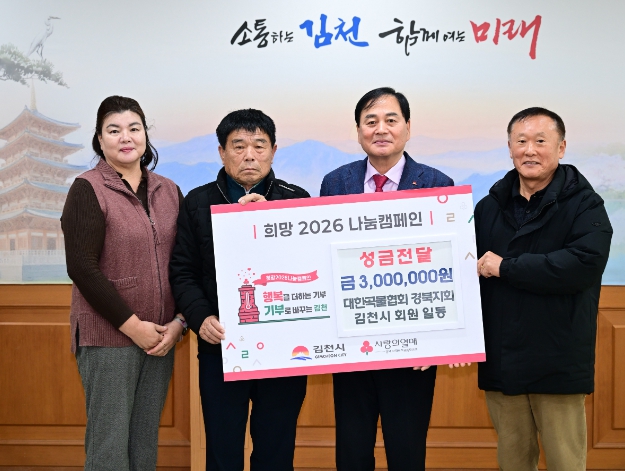 [무한뉴스=최진수 기자] 대한곡물협회 김천시지부(지부장 윤진채)에서는 26일 김천시청을 방문해 ‘희망2026 나눔캠페인’ 성금 300만 원을 기부했다.