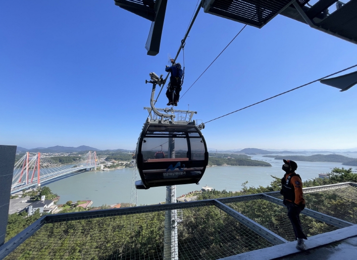 [무한뉴스=정민정 기자] 가을여행주간을 맞이하여 전남도로 많은 가족단위 여행객들이 방문이 많아지면서 안전에 대한 관심이 높아지고 있는 가운데 명량해상케이블카는 지난 10월 20일 비상상황 대응 능력을 강화하기 위해 진도소방서와 함께 케이블카 합동 구조훈련을 실시했다.