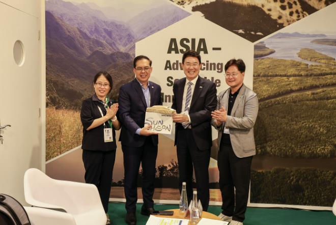 | ▲ 지난 9일 아랍에미리트 아부다비에서 노관규 순천시장이 딘도 캄필란(Dindo Campilan) IUCN 아시아지역책임자와 양자회담을 갖고 기념사진을 촬영하고 있다 |
