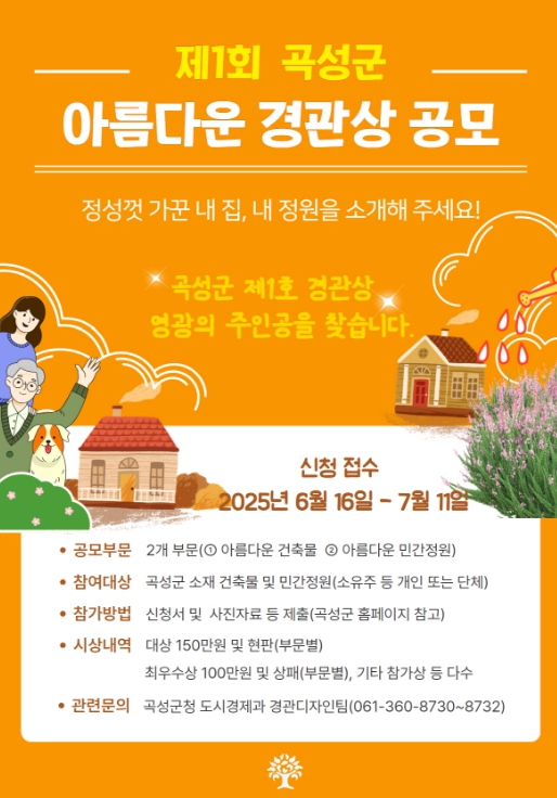이번 공모 접수는 오는 7월 11일까지 곡성군청 도시경제과 방문 또는 우편, 이메일로 가능하며, 자세한 사항은 군 홈페이지 또는 경관디자인팀을 통해 확인할 수 있다.