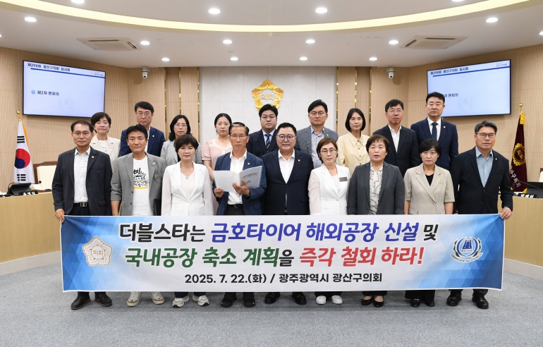 광산구의회는 국강현 의원(진보당, 송정1·2동·도산동·어룡동·동곡동·평동·삼도동·본량동)이 대표발표한 ‘금호타이어 해외공장 신설 및 국내공장 축소 계획 철회 촉구 성명서’를 통해 “노사 간 신공장 건설 로드맵 논의가 진행 중임에도 회사 측과 더블스타는 광주공장의 생산 규모를 1,200만 본에서 350만 본 규모로 축소하고, 유럽에 1단계 600만 본, 2단계 1,200만 본 규모의 공장 건설을 계획 중이다”고 지적했다.