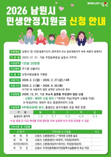 한편, 남원시는 2025년 1월에도 1인당 30만 원, 총 230억 원 규모의 민생안정지원금을 전액 시비로 편성해 지급한 바 있다.