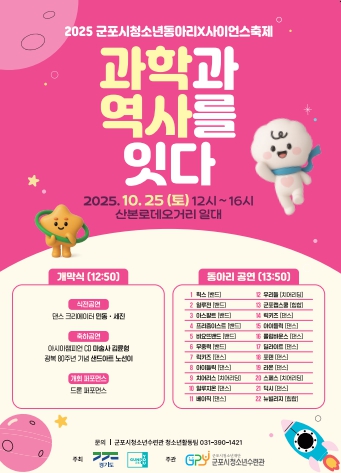 [무한뉴스=손성기 기자] (재)군포시청소년재단 산하 군포시청소년수련관은 오는 10월 25일 12시부터 16시까지 산본로데오거리 일대에서 2025 군포시청소년동아리X사이언스축제 ‘과학과 역사를 잇다’를 펼친다. 청소년들에게 공연과 과학, 역사 체험의 기회를 제공하고 지역사회의 참여를 끌어내겠다는 취지이다.