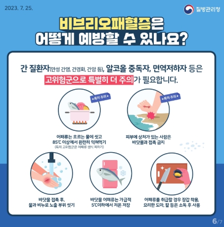 비브리오패혈증 예방을 위해 ▲어패류 손질 시 장갑 착용 ▲조리도구 사용 전후 소독 ▲어패류 저온 보관 ▲수돗물로 깨끗이 세척 ▲85℃ 이상 충분히 가열 섭취 ▲상처 난 피부는 노출되지 않도록 주의해야 한다.