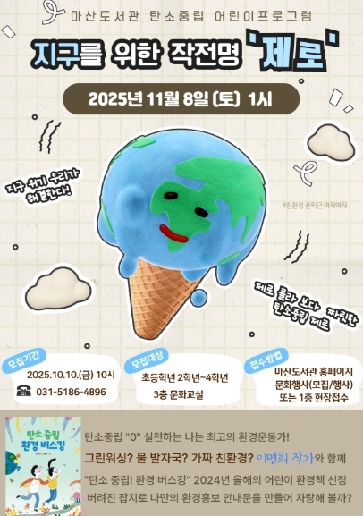 [무한뉴스=정승훈 기자] 김포시 마산도서관에서 오는 11월 8일 오후 1시부터 3시까지, 초등학교 2학년~4학년 어린이를 대상으로 탄소중립 어린이 프로그램 책풍당당 '지구를 위한 작전명 ‘제로’'를 운영한다.