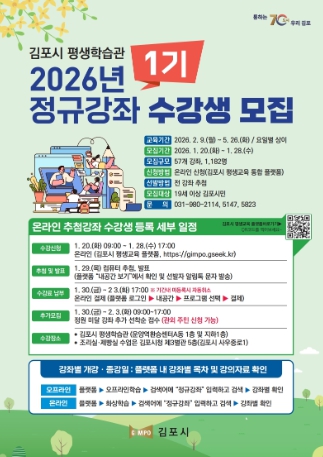 [무한뉴스=정승훈 기자] 김포시 평생학습관은 시민의 지속적인 평생학습 참여와 자기계발을 지원하기 위해 ‘2026년 제1기 평생학습관 정규강좌’ 수강생을 모집한다.