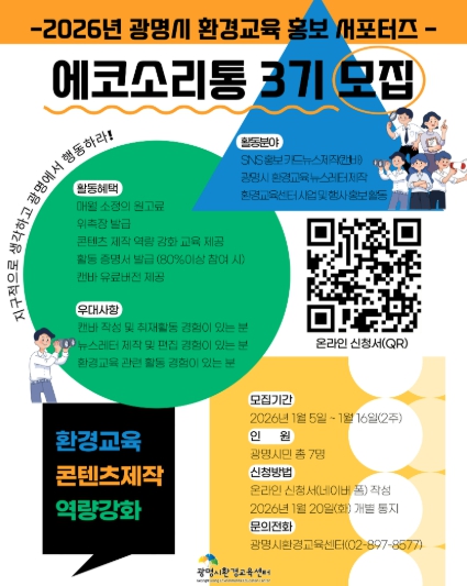 [무한뉴스=정승훈 기자] 광명시가 오는 16일까지 시민의 시각에서 지역 환경교육 현안을 생생하게 전달할 홍보 서포터즈 ‘에코소리통 3기’를 모집한다.