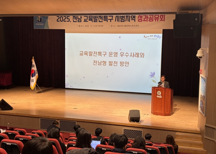 [무한뉴스=정승훈 기자] 전라남도교육청이 12월 3일 화순하니움문화스포츠센터에서 ‘2025. 교육발전특구 시범지역 교육청-지자체 합동 성과공유회’를 열어 교육발전특구 사업 추진 경과를 돌아보고, 2027년 교육발전특구 정식 지정을 위한 향후 과제를 논의했다.