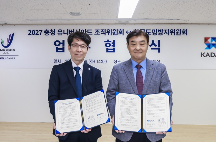 [무한뉴스=최진수 기자] 2027 충청 유니버시아드대회 조직위원회는 16일 대회의실에서 한국도핑방지위원회(KADA)와 ‘도핑 관리 업무 협약’을 체결했다고 밝혔다.