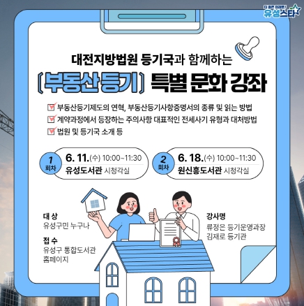 이번 강좌는 대전지방법원 등기국과 협업해 마련됐으며, 등기 실무 담당자를 강사로 초빙해 일반인에게 다소 생소할 수 있는 부동산 등기 관련 법률 정보를 쉽게 전달할 예정이다.