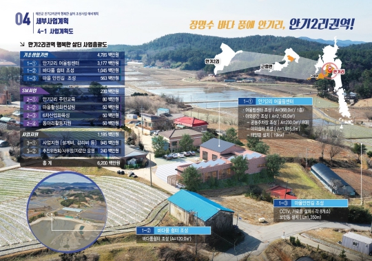 이에 도는 장명수바다품에 안기리마을 만들기’라는 비전 실현을 목표로, 2030년까지 △안기2리 어울림센터 신축 △바다품 쉼터조성 △마을 안전길 조성을 추진한다.