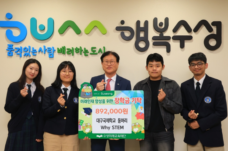 김대권 수성미래교육재단 이사장은 “학교 교육 발전과 미래 세대의 역량 성장을 위해 따뜻한 관심을 보내주신 동아리 회원 여러분께 진심으로 감사드린다”며, “기탁해주신 장학금은 수성구의 미래를 이끌어갈 인재들이 다양한 꿈을 펼칠 수 있도록 소중히 사용하겠다”고 말했다.